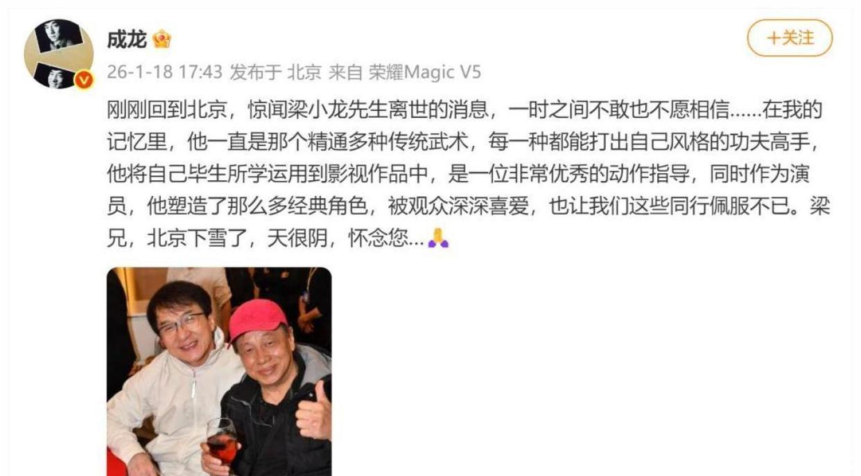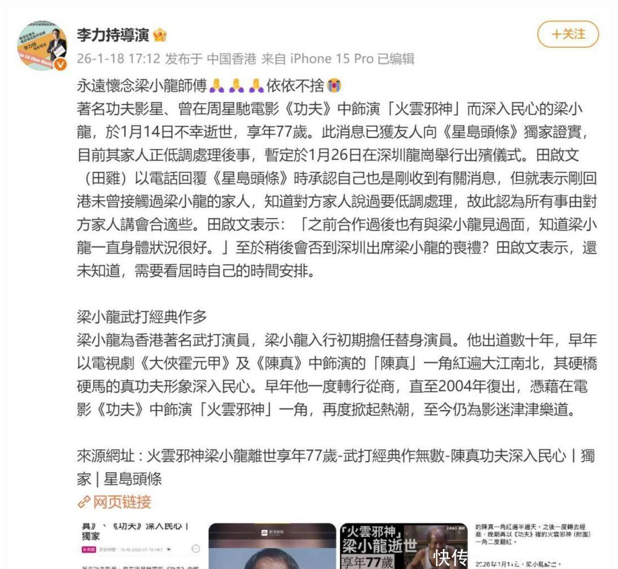 这反差太残忍了。很多人第一反应是:账号被盗?还是MCN蹭热度?结果经纪人赶紧出来澄清:**这是梁小龙生前就交代好的** 他喜欢神秘感 想让大家觉得他只是“远行拍戏”。家人原本计划把死讯藏到**1月26日深圳龙岗出殡**后再公布。没想到内部有人泄密 港媒18日抢先爆出 经纪人气到公开怼“大嘴巴”。梁小龙这一生,就是一部活生生的**逆袭打脸史**。 1970年代末 他从替身演员一步步杀到主角。